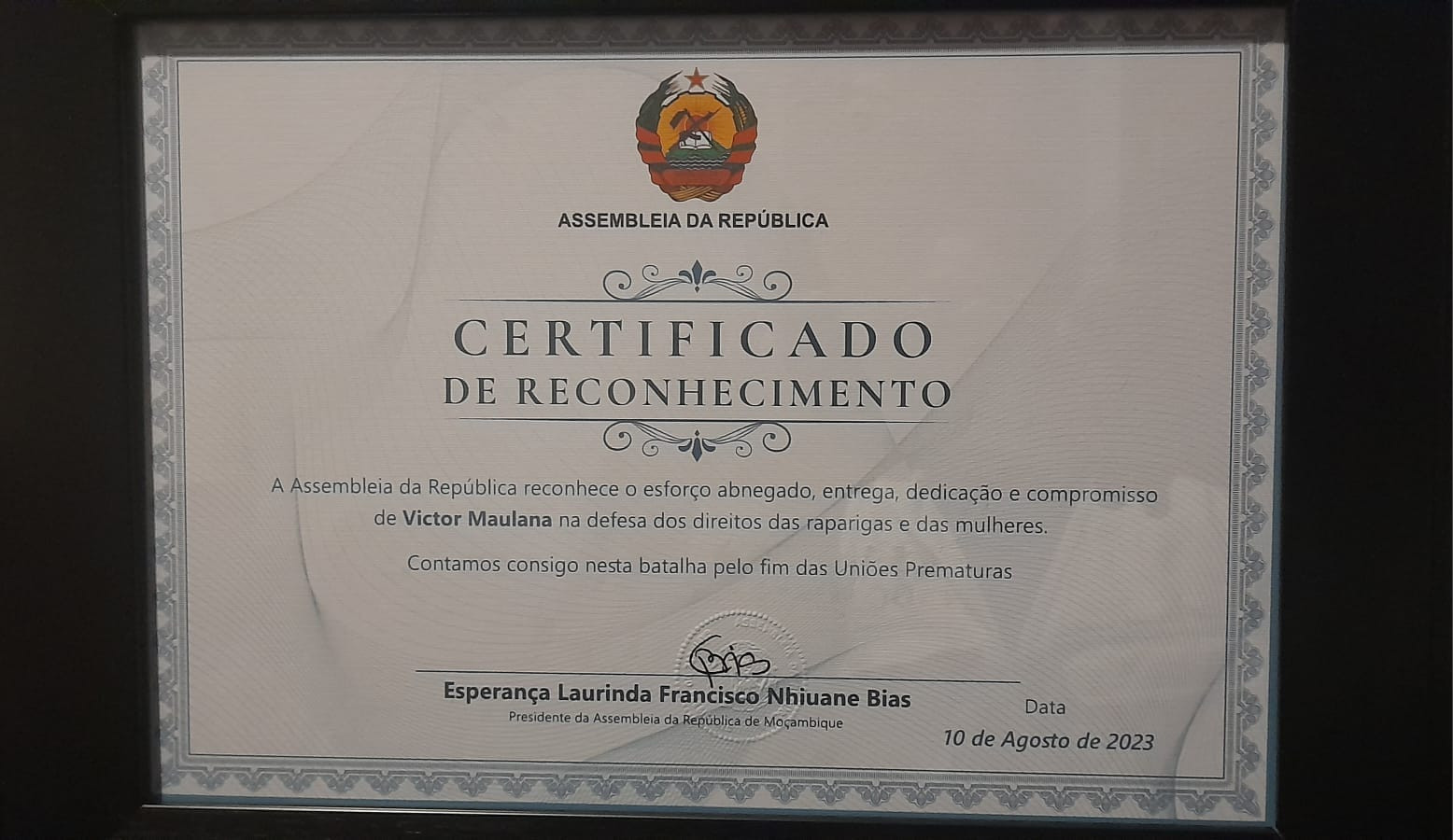 A Assembleia da República de Moçambique atribuiu um Diploma de Mérito a Victor Maulana, Coordenador Executivo da Associação Amigos da Criança Boa Esperança - ACABE, em reconhecimento pelo seu esforço abnegado, entrega, dedicação e comprometimento na defesa dos direitos das raparigas e mulheres na província do Niassa.